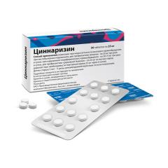 1 таблетка содержит: активное вещество: циннаризин - 0,025 г, вспомогательные вещества: крахмал картофельный - 0,0178 г, лактоза (сахар молочный) - 0,102 г, повидон среднемолекулярный - 0,0030 г, кремния диоксид коллоидный (аэросил) - 0,0007 г, магния стеарат - 0,0015 г.