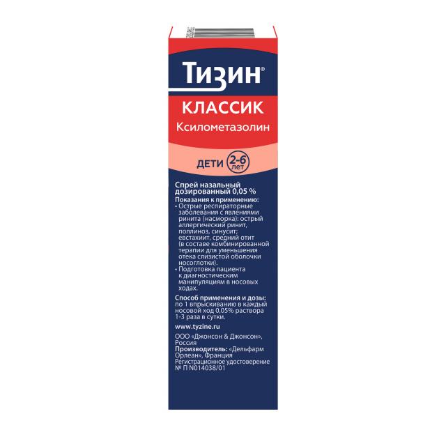 - Если не назначено иное, по одной дозе препарата Тизин® Классик в виде 0,05% спрея назального дозированного в каждый носовой ход 1-2 раза в сутки.