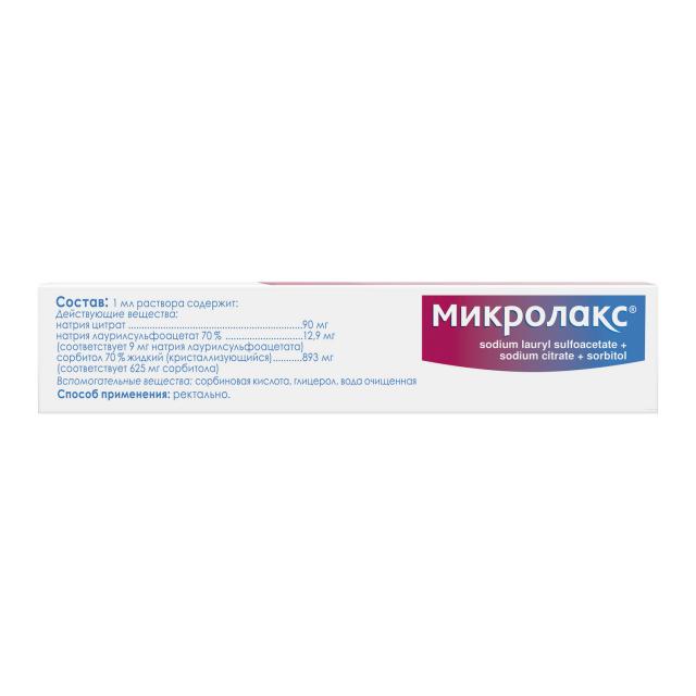 Микролакс® - комбинированный препарат, оказывающий слабительное действие. Эффект наступает через 5-15 мин. В состав препарата входят натрия цитрат (пептизатор, который вытесняет связанную воду, содержащуюся в каловых массах), натрия лаурилсульфоацетат (разжижает содержимое кишечника) и сорбит (усиливает слабительное действие путем стимуляции поступления воды в кишечник). Увеличение количества воды за счет пептизации и разжижения способствует размягчению каловых масс и облегчает опорожнение кишечника.