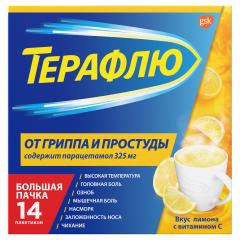 Терафлю со вкусом лимона от гриппа и простуды в экономичной упаковке с выгодой в 3 пакетика *. Порошок для приготовления раствора для приема внутрь предназначен для симптоматического лечения инфекционно-воспалительных заболеваний (ОРВИ, в том числе гриппа), проявлениями которых являются: