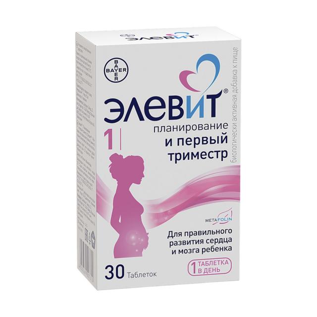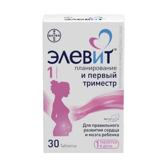 Элевит® 1 - Элевит® Планирование и Первый Триместр БАД к пище. Рекомендован для применения во время планирования беременности / с первого дня беременности и до начала 2-го триместра. Содержит специальную форму фолатов – Метафолин®, 11 витаминов и 8 микроэлементов, включая йод и железо. Способствует правильному развитию сердца и мозга ребенка.