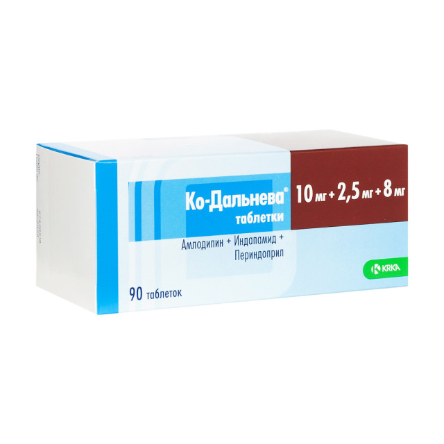 Ко-Дальнева - комбинированный препарат, содержащий периндоприла эрбумин (ингибитор АПФ), индапамид (тиазидоподобный диуретик) и амлодипин (блокатор "медленных" кальциевых каналов (БМКК)).