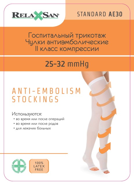Антиэмболические чулки на резинке Relaxsan® Medicale арт. M2460A - с открытым мыском, давление 25-32 мм. рт. ст., Il класс компрессии. Лечебные чулки с распределенным давлением разработаны специально для предотвращения тромбоэмболических проблем. Открытый мысок позволяет контролировать состояние кровообращения ног.