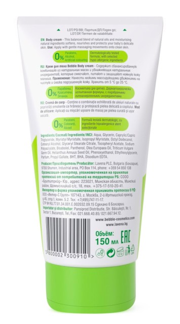 Легкий и нежный крем для тела Bebble может только дополнить неописуемое ощущение прикосновения к мягкой коже малыша. Идеально подходит для повседневного ухода, питает и увлажняет кожу. Крем для тела легко наносится и быстро впитывается, не оставляя жирных следов.