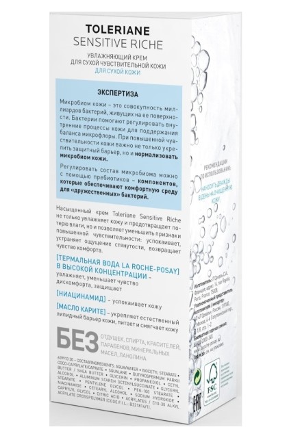 Новая экспертиза: Микробиом кожи это совокупность миллиардов бактерий, живущих на поверхности кожи. Бактерии помогают регулировать внутренние процессы кожи для поддержания баланса микрофлоры. При повышенной чувствительности кожи важно не только укрепить её защитный барьер, но и нормализовать состав микробиома кожи. Регулировать состав микробиома можно с помощью пребиотиков - комопнентов, которые обеспечивают комфортную среду для дружественных микроорганизмов. Пребиотический уход Toleriane Sensitive Riche не только увлажняет кожу и предотвращает потерю влаги, но и позволяет уменьшить признаки повышенной чувствительности: успокаивает, устраняет ощущение стянутости, возвращает чувство комфорта. Без отдушек, спирта, красителей, парабенов, минеральных масел, ланолина. Высокие стандарты безопасности, свойственные марке La Roche-Posay.