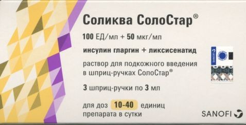 Препарат Соликва СолоСтар® является комбинированным препаратом, в состав которого входят два гипогликемических средства с дополняющими друг друга механизмами действия: инсулин гларгин, аналог инсулина длительного действия, и ликсисенатид, агонист рецепторов глюкагоноподобного пептида-1 (ГПП-1). Действие препарата направлено на снижение концентрации глюкозы в крови натощак и после приема пищи (постпрандиальной концентрации глюкозы в крови), что улучшает гликемический контроль у пациентов с сахарным диабетом 2 типа (СД2), но при этом минимизируется увеличение массы тела и риск развития гипогликемии.