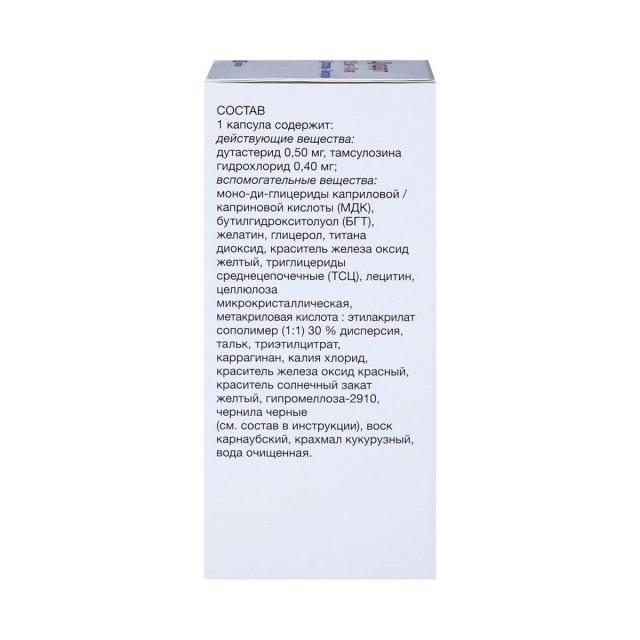 Содержимое капсул: одна продолговатая непрозрачнаяматово-желтого цвета мягкая желатиновая капсула, содержащая дутастерид, и пеллетыот белого до почти белого цвета, содержащие тамсулозина гидрохлорид.