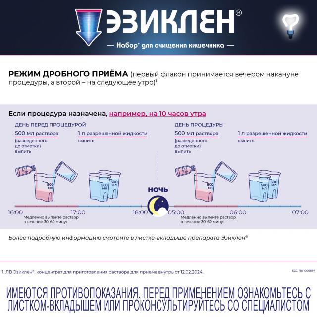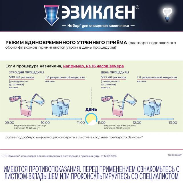 Прием полного объема разведенного раствора препарата Эзиклен® и дополнительного количества воды или прозрачной жидкости должен быть закончен как минимум за 2 часа и не позднее 4 часов до начала процедуры.