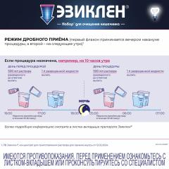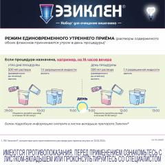 Препарат принимают либо в режиме дробного применения (первый флакон принимается вечером накануне процедуры, а второй - на следующее утро), либо в режиме единовременного применения (прием накануне процедуры). Подходящий режим приема препарата Эзиклен® может быть определен врачом.