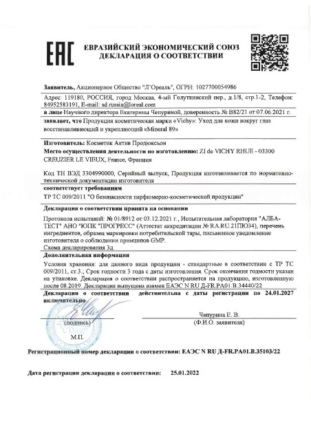 Восстанавливающий и укрепляющий уход для кожи вокруг глаз Mineral 89 с рекордной концентрацией термальной воды Vichy [89%]. Ежедневные агрессивные воздействия внешних факторов оказывают негативное влияние на тонкую кожу вокруг глаз. Она истончается, нарушается её защитный барьер и способность к регенерации. Mineral 89 для кожи вокруг глаз, средство с рекордной концентрацией термальной воды* Vichy [89%] вулканического происхождения, обогащённой 15 минералами, нормализует баланс pH, укрепляет и защищает кожу. В состав средства также входят гиалуроновая кислота натурального происхождения и чистый кофеин. Клинически доказанная эффективность. Гипоаллергенно. Протестировано под контролем дерматологов и офтальмологов. Подходит при использовании контактных линз. Подходит для деликатной чувствительной кожи вокруг глаз. Всего 13 компонентов. Без спирта, отдушек, парабенов, силиконов.