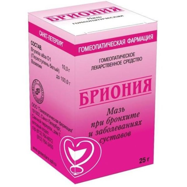 Мазь для наружного применения гомеопатическая.Состав (на 100 г): активный компонент: Bryonia alba (Bryonia) (бриония альба (бриония)) D1 10 г; вспомогательный компонент: вазелин до 100 г