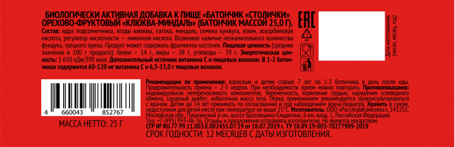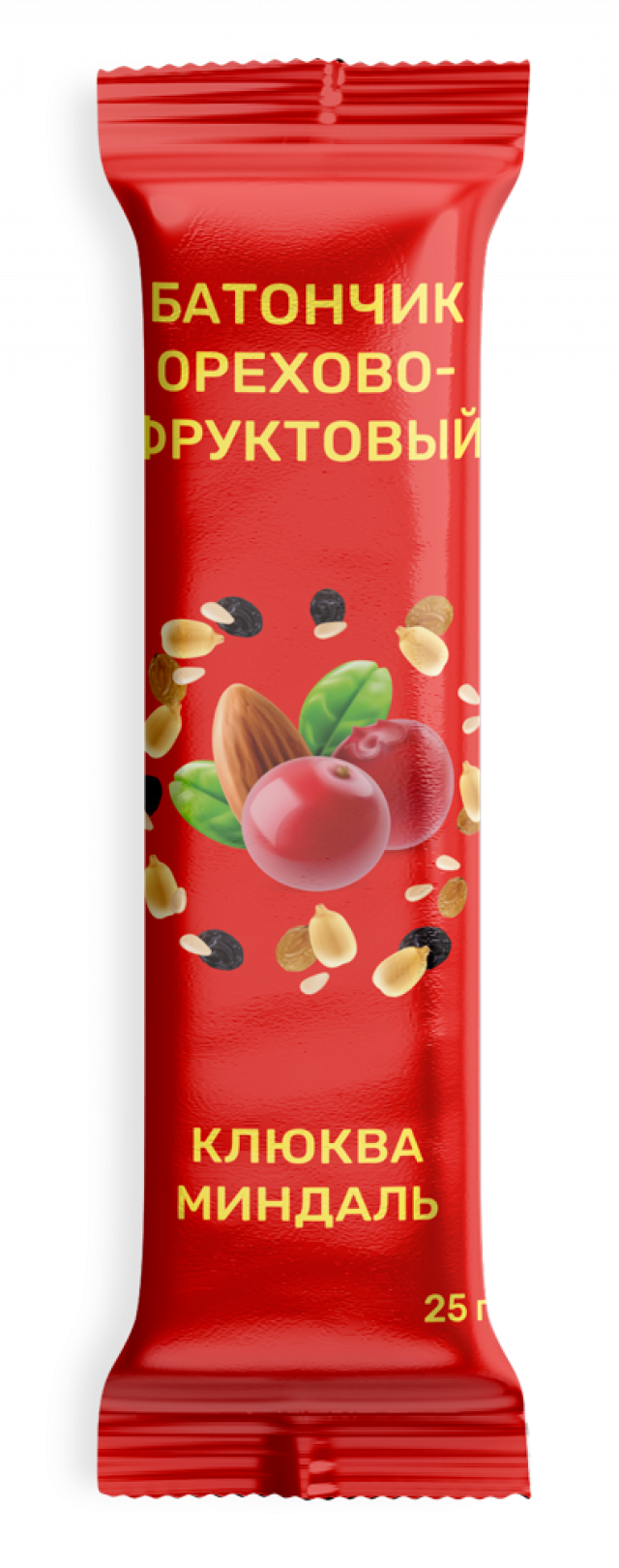 ядра подсолнечника, патока, клюква, миндаль, кунжут, изюм, цитрусовая клетчатка, аскорбиновая кислота, регулятор кислотности лимонная кислота. Возможно наличие незначительного количества фундука, грецкого ореха. Продукт может содержать фрагменты косточек.