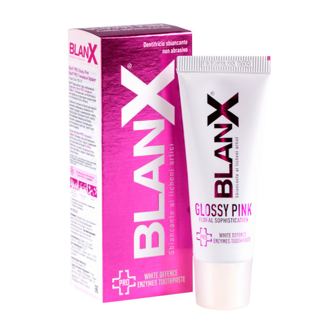Blanx Pro Glossy Pink - отбеливающая зубная паста для ежедневного использования, содержит экстракт исландского мха и отбеливающие ферменты папаин и бромелайн.