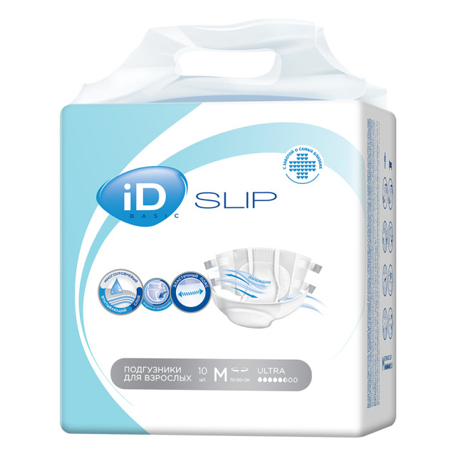 При создании линейки подгузников для взрослых iD SLIP Basiс удалось достичь оптимального баланса в сочетании материалов и особенностей конструкции подгузника, что делает его более экономичным. Многоуровневый впитывающий слой наделяет изделие высокой влагоёмкостью и хорошей влагоудерживающей способностью. Конструкция изделия предотвращает протекания и блокирует распространение неприятных запахов. Анатомическая форма, эластичный пояс и манжеты в области бёдер, а также многоразовые липучки-фиксаторы позволяют комфортно посадить подгузник на любом типе фигуры. Индикатор влагонасыщения помогает быстро понять, когда пора менять подгузник.