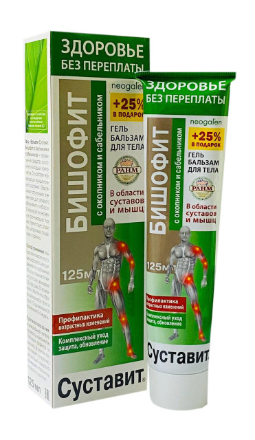 Гель - бальзам Суставит. Бишофит с окопником и сабельником - эффективное натуральное средство профилактики заболеваний суставов и позвоночника. Создан на основе уникального природного минерала бишофит, хондропротек-тора глюкозамин и экстрактов лекарственных растений. Способствует естественной регенерации суставных тканей, препятствует развитию дистрофических процессов и преждевременному старению суставов. Оказывает противовоспалительное, противоотечное, солевыводящее, болеутоляющее и спазмолитическое действие, улучшает кровоснабжение и питание суставов.