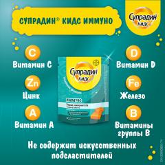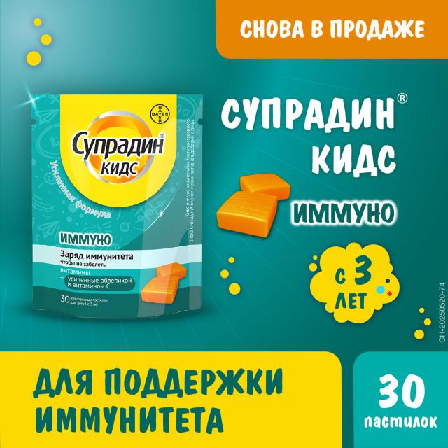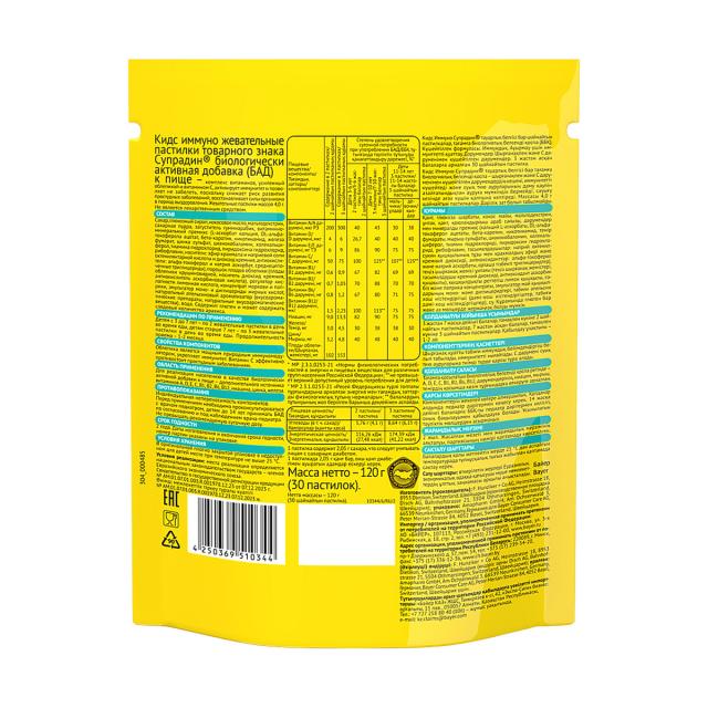 КИДС ИММУНО ЖЕВАТЕЛЬНЫЕ ПАСТИЛКИ ТОВАРНОГО ЗНАКА СУПРАДИН® БИОЛОГИЧЕСКИ АКТИВНАЯ ДОБАВКА К ПИЩЕ - комплекс витаминов, усиленный облепихой и витамином С, активирует иммунитет и позволяет не заболеть, поскольку снижает риск развития простудных заболеваний; восстанавливает силы организма в период выздоровления. Жевательные пастилки массой 4,0 г.