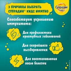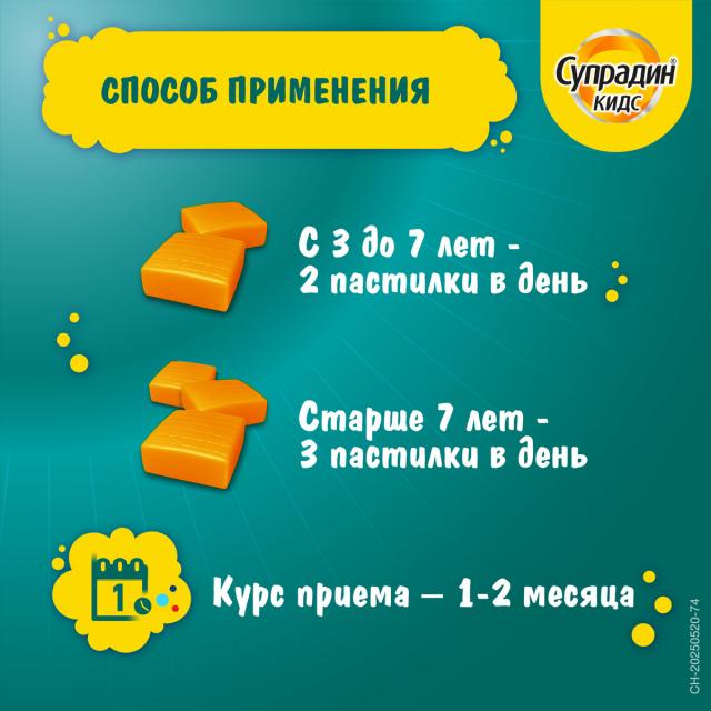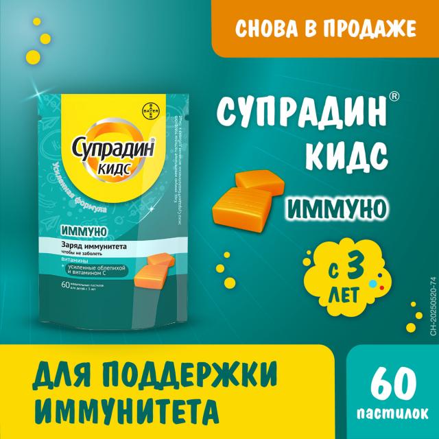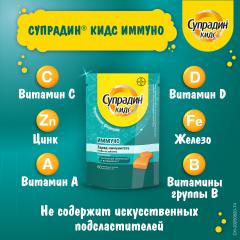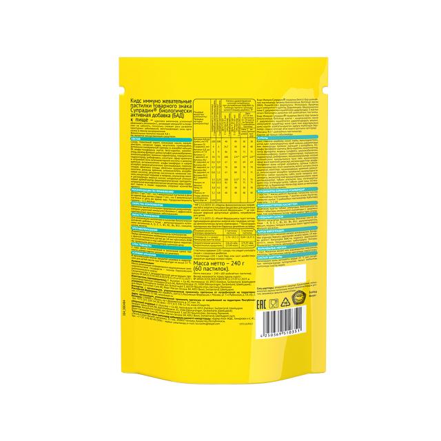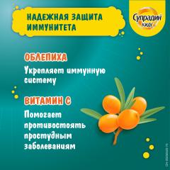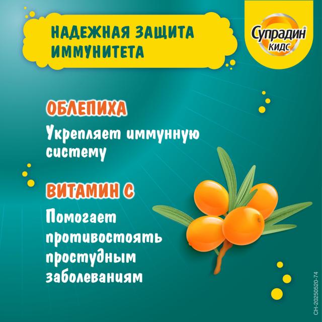КИДС ИММУНО ЖЕВАТЕЛЬНЫЕ ПАСТИЛКИ ТОВАРНОГО ЗНАКА СУПРАДИН® БИОЛОГИЧЕСКИ АКТИВНАЯ ДОБАВКА К ПИЩЕ - комплекс витаминов, усиленный облепихой и витамином С, активирует иммунитет и позволяет не заболеть, поскольку снижает риск развития простудных заболеваний; восстанавливает силы организма в период выздоровления. Жевательные пастилки массой 4,0 г.
