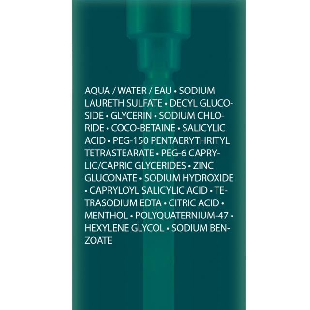 Aqua / water, sodium laureth sulfate, decyl glucoside, glycerin, sodium chloride, coco-betaine, salicylic acid, peg-150 pentaerythrityl tetrastearate, peg-6 caprylic/capric glycerides, zinc gluconate, sodium hydroxide, capryloyl salicylic acid, tetrasodium edta, citric acid, menthol, polyquaternium-47, hexylene glycol, sodium benzoate