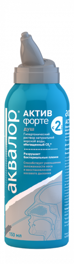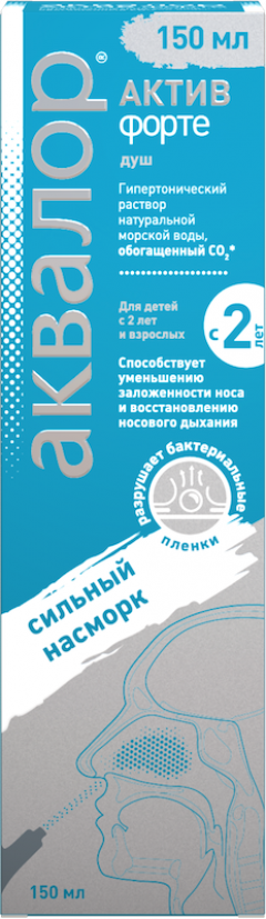 Аквалор Актив Форте — гипертонический раствор, предназначенный для тщательного промывания носа и лечения сильного насморка у взрослых и детей с 2 лет.