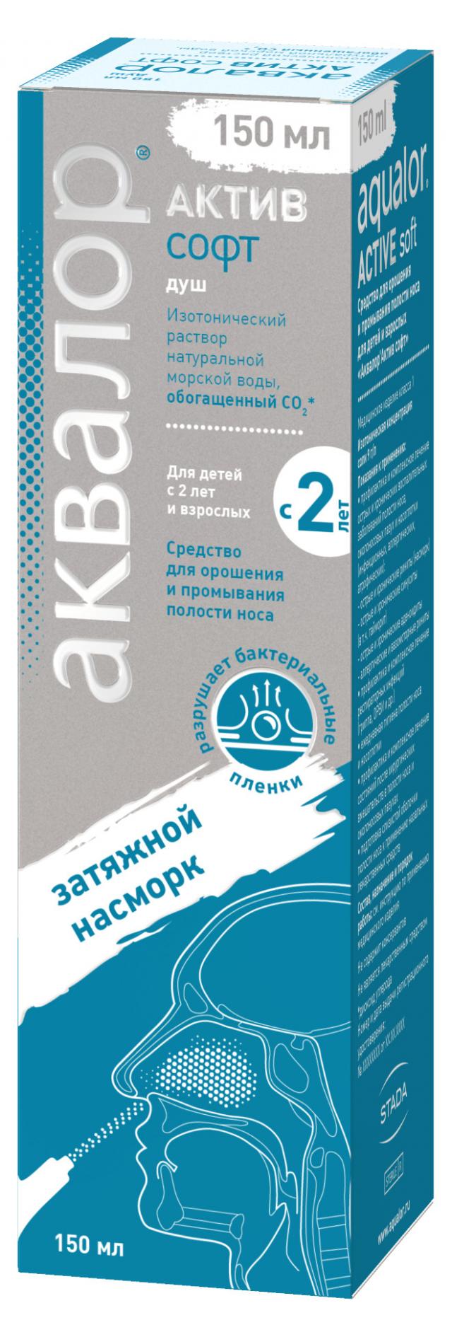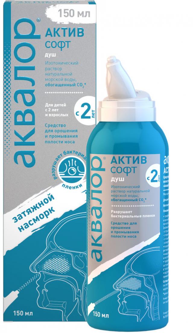 Аквалор Актив Софт — изотонический раствор морской воды, предназначенный для тщательного промывания полости носа, профилактики и лечения острого и хронического насморка у взрослых и детей с 2 лет. Средство обладает увлажняющим, иммуностимулирующим действием, которое обусловлено свойствами натуральной морской воды. Ее забор производится в экологически чистых районах Атлантического океана в территориальных водах Франции и Швеции. Специальная очистка и фильтрация позволяет сохранить в морской воде полезные микроэлементы и минералы.