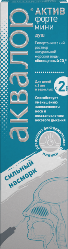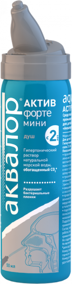 Аквалор «Актив Форте Мини» - гипертонический раствор, предназначенный для тщательного промывания носа и лечения сильного насморка у взрослых и детей с 2 лет. Средство содержит натуральную морскую воду, которая забирается из экологически чистых районов Атлантического океана. Она проходит специальную очистку и фильтрацию, что позволяет сохранить в ней полезные микроэлементы и минералы.
