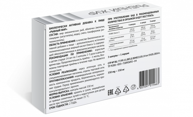 Состав: жир океанических рыб, оболочка (желатин, глицерин (загуститель), вода), смесь токоферолов (антиокислитель).