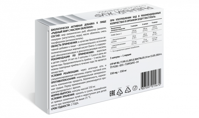 Состав: жир океанических рыб, оболочка (желатин, глицерин (загуститель), вода), масло облепихи, смесь токоферолов (антиокислитель).