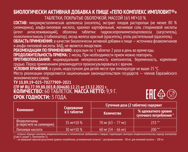 ** не превышает верхний допустимый уровень потребления, установленный согласно *: для флаволигнанов (силимарина) - 80 мг, для липоевой кислоты - 100 мг.