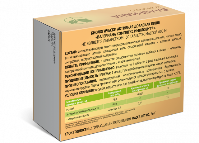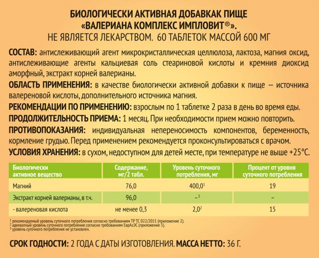Состав: антислеживающий агент микрокристаллическая целлюлоза, лактоза, магния оксид, антислеживающие агенты кальциевая соль стеариновой кислоты и кремния диоксид аморфный, экстракт корней валерианы.