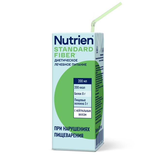 Nutrien® Standard Fiber (Нутриэн® Стандарт c пищевыми волокнами) 200 мл – полноценное лечебное питание, готовое к употреблению для профилактики и устранения недостаточности питания, а также коррекции состава рациона питания. Композиция растворимых и нерастворимых пищевых волокон и пребиотиков нормализует процесс пищеварения, обладает пребиотическим и антиатерогенным действием.