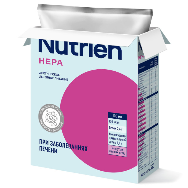 Nutrien® Hepa (Нутриэн® Гепа) 350г - полноценное диетическое лечебное (энтеральное) питание для профилактики и устранения недостаточности питания для пациентов с печеночной недостаточностью. Нутриэн Гепа содержит аминокислоты, витамины и микроэлементы, которые помогают бороться с жировыми отложениями в печени, оказывают антиоксидантное действие и улучшают работу организма в целом