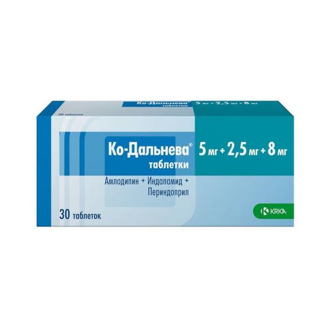 Ко-Дальнева® - комбинированный препарат, содержащий периндоприла эрбумин (ингибитор АПФ), индапамид (тиазидоподобный диуретик) и амлодипин (блокатор "медленных" кальциевых каналов (БМКК)).