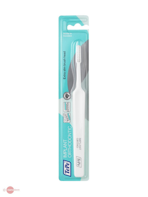 Специальная зубная щетка для ухода за имплантами и ортодонтическими конструкциями с мягкими щетинками, идущими в два ряда, узкой головкой и длинной тонкой шейкой позволяет эффективно очищать импланты и ортодонтические скобы.