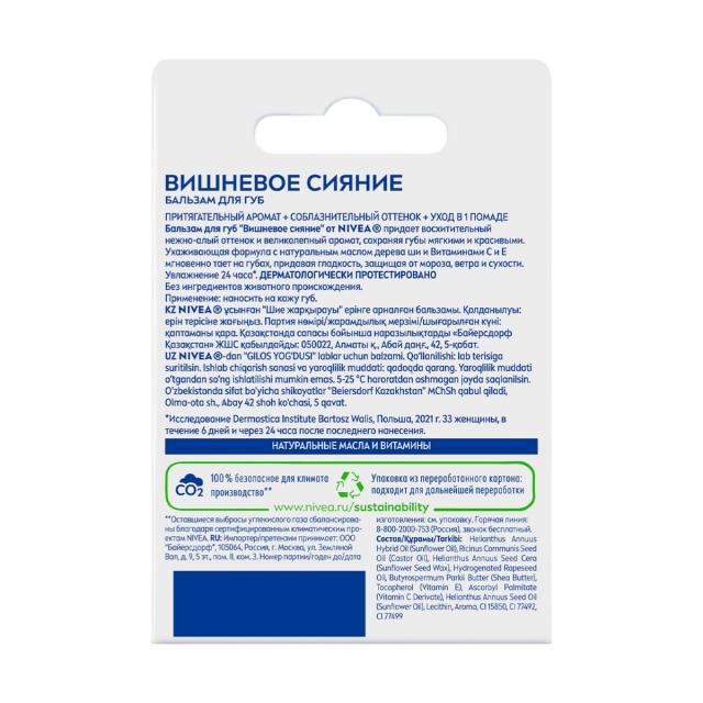 Притягательный аромат, соблазнительный оттенок, уход в одной помаде. Бальзам для губ "Вишневое сияние" от NIVEA придает восхитительный нежно-алый оттенок и великолепный аромат, сохраняя губы мягкими и красивыми. Гигиеническая помада ухаживает за губами, придавая им более гладкий и увлажненный вид. Усовершенствованная' ухаживающая формула с натуральным маслом дерева ши и витаминами С и Е мгновенно тает на губах, придавая гладкость, защищая от мороза, ветра и сухости. Увлажнение 24 часа*. Подходит для использования в любое время года, особенно в весенне-летний период для естественного сияния и легкого увлажнения. Натуральные масла и витамины в составе. Дерматологически протестировано. Без ингредиентов животного происхождения.