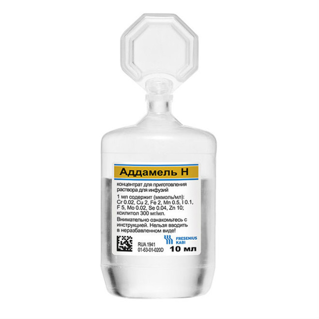 Аддамель Н - практически бесцветный раствор микроэлементов,предназначенный для добавления в инфузионные растворы. Содержимое одной ампулы обеспечивает суточную потребность в микроэлементах.