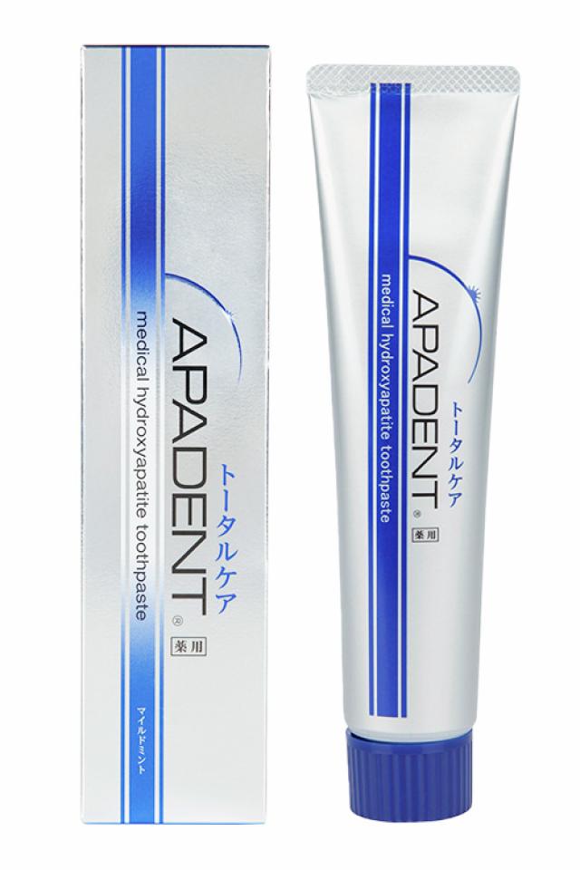 Лечебно-профилактическая японская зубная паста APADENT® Total Care с Медицинским Нано-Гидроксиапатитом глубоко реминерализует и восстанавливает эмаль, борется с чувствительностью зубов и предотвращает развитие кариеса. Без фтора. Все заявленные свойства подтверждены клиническими исследованиями на протяжении 40 лет! Эмаль зубов на 97% состоит из Гидроксиапатита. В зубной пасте АPADENT Гидроксиапатит Кальция содержится в форме нано-частиц, что позволяет ему проникать глубоко в структуру эмали и восполнять потери минералов на истощенных участках, встраиваясь в ткани зуба на молекулярном уровне. Высокая биодоступность и биосовместимость Нано-Гидроксиапатита (NANO<mHAP>®) позволяет восстанавливать эмаль глубоко изнутри, а не только на поверхности, в отличие от других зубных паст.