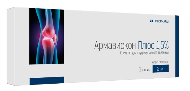 Армавискон Плюс представляет собой стерильный вязкий раствор натриевой соли гиалуроновой кислоты (натрия гиалуроната) высокой степени очистки, высокомолекулярный (молекулярная масса составляет не менее 3 МДа). Гиалуроновая кислота - необходимый компонент экстрацеллюлярного матрикса, присутствует в высоких концентрациях в составе хряща и синовиальной жидкости. Гиалуроновая кислота обеспечивает вязкость и эластичность синовиальной жидкости, а также она необходима для формирования хряща. При остеоартрозе отмечаются дефицит и качественные изменения гиалуроновой кислоты в составе синовиальной жидкости и хряща. Внутрисуставное введение гиалуроновой кислоты приводит к улучшению функционального состояния сустава. При использовании средства Армавискон Плюс при остеоартрозе коленного сустава отмечается улучшение клинического течения остеоартроза до шести месяцев с момента применения, наблюдается противовоспалительный и анальгетический эффект за счет восполнения объема и восстановления вязкости и эластичности синовиальной жидкости, которая заполняет полость сустава и выполняет роль внутрисуставной смазки. Она предотвращает трение суставных поверхностей, что позволяет устранить болевые ощущения и воспаление, а также защищает от преждевременного изнашивания и разрушения гиалинового хряща, обеспечивает подвижность, имеет амортизационные способности (гасит внешние удары, защищая компоненты сустава от повреждения).