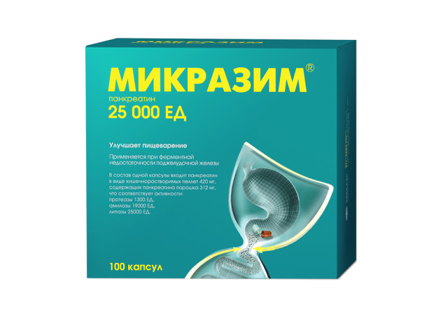 Микразим® - пеллеты панкреатина в капсулах. В состав препарата входят натуральные ферменты из поджелудочной железы животных - протеаза, липаза и амилаза, обеспечивающие переваривание белков, жиров и углеводов пищи.