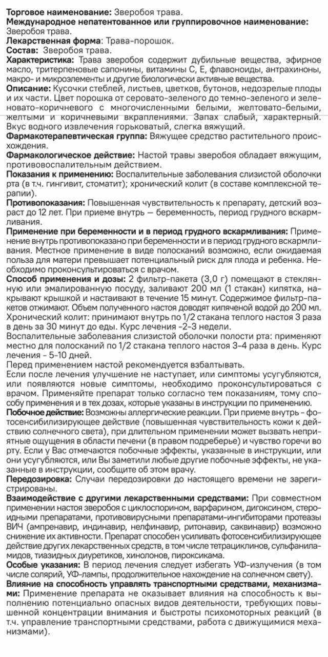 Способ применения и дозы: 10 г (2 столовые ложки) травы зверобоя помещают в эмалированную посуду, заливают 200 мл (1 стакан) горячей кипяченой воды, закрывают крышкой и нагревают на кипящей водяной бане 15 минут, охлаждают при комнатной температуре в течение 45 минут, процеживают, оставшееся сырье отжимают. Объем полученного настоя доводят кипяченой водой до 200 мл. Принимают внутрь по 1/2 стакана 3 раза в день за 30 минут до еды. Курс лечения -2-3 недели. Для полосканий применяют по 1/2 стакана настоя 3-4 раза в день. Курс лечения -5-10 дней. Перед применением настой рекомендуется взбалтывать.