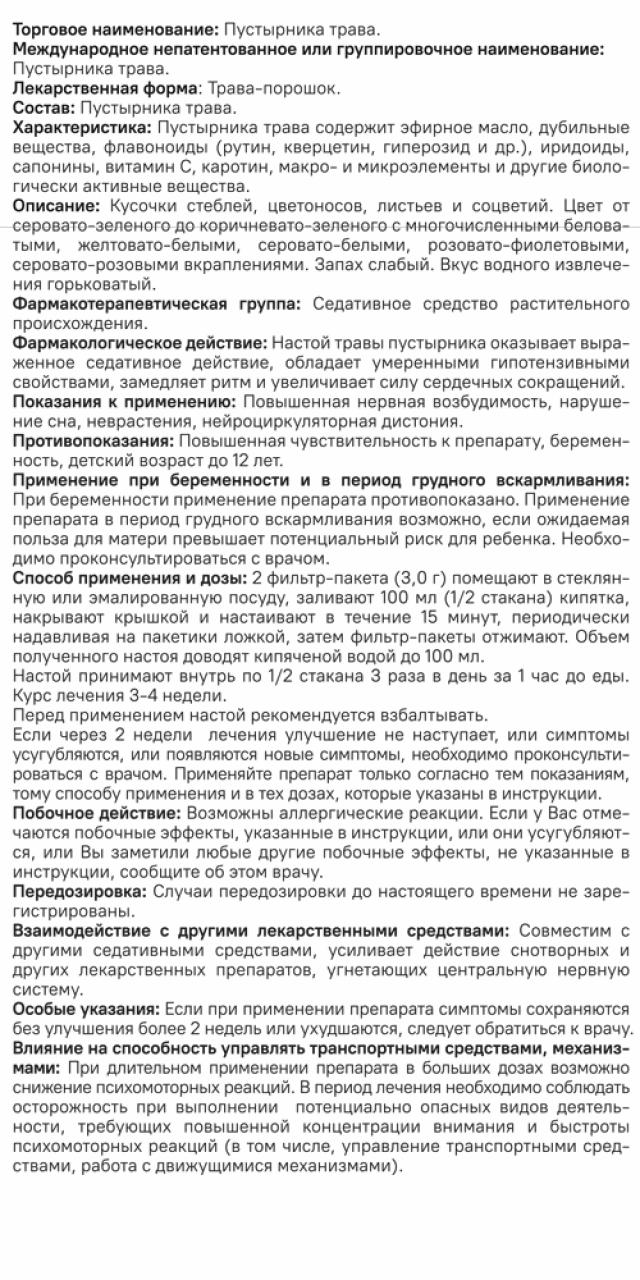 Способ применения и дозы: Около 9 г (2 столовые ложки) травы пустырника помещают в эмалированную посуду, заливают 200 мл (1 стакан) горячей кипяченой воды, закрывают крышкой и настаивают на кипящей водяной бане в течение 15 минут, охлаждают при комнатной температуре 45 минут, процеживают, оставшееся сырье отжимают. Объем полученного настоя доводят кипяченой водой до 200 мл. Настой принимают внутрь по 1/4 –1/3 стакана 2-3 раза в день за 15 минут до еды. Перед употреблением настой рекомендуется взбалтывать.