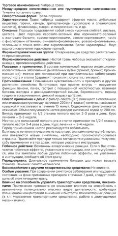 Показания к применению: Настой травы чабреца применяют внутрь в качестве отхаркивающего средства при воспалительных заболеваниях дыхательных путей -ларингитах, трахеитах, бронхитах, бронхопневмониях, местно-для полосканий при воспалительных заболеваниях полости рта и глотки.