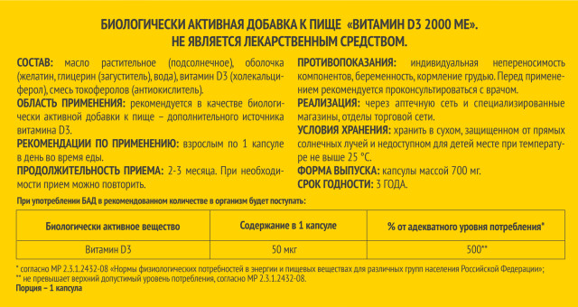 Область применения: рекомендуется в качестве биологически активной добавки к пище – дополнительного источника витамина D3.