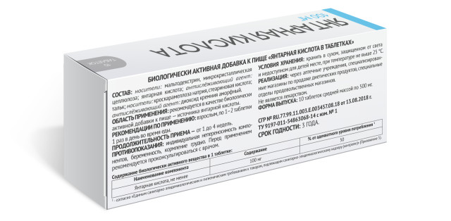 Область применения: рекомендуется в качестве биологически активной добавки к пище — источника янтарной кислоты.