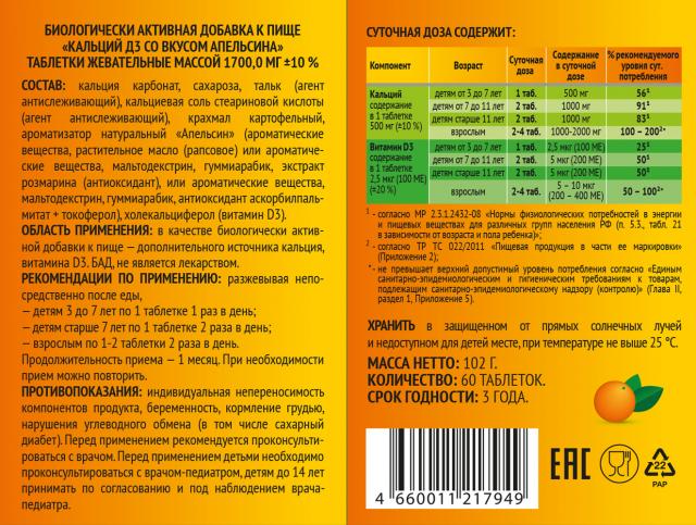 Состав: кальция карбонат, сахароза, тальк (агент антислеживающий), кальциевая соль стеариновой кислоты (агент антислеживающий), крахмал картофельный, ароматизатор натуральный «Апельсин» (ароматические вещества, растительное масло (рапсовое) или ароматические вещества, мальтодекстрин, гуммиарабик, экстракт розмарина (антиоксидант), или ароматические вещества, мальтодекстрин, гуммиарабик, антиоксидант аскорбилпальмитат + токоферол), холекальциферол (витамин D3).