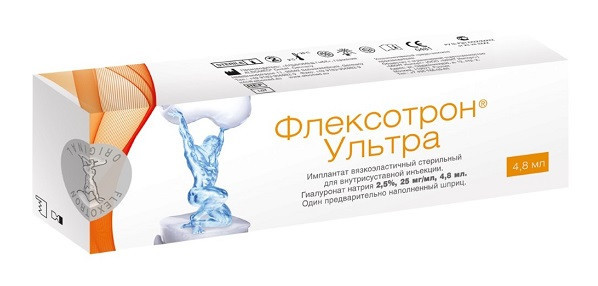 ФЛЕКСОТРОН® Ультра - протез синовиальной жидкости, стерильный, прозрачный вязкоэластичный гель, содержащий гиалуронат натрия, получаемый методом бактериальной ферментации, в фосфатном буфере.