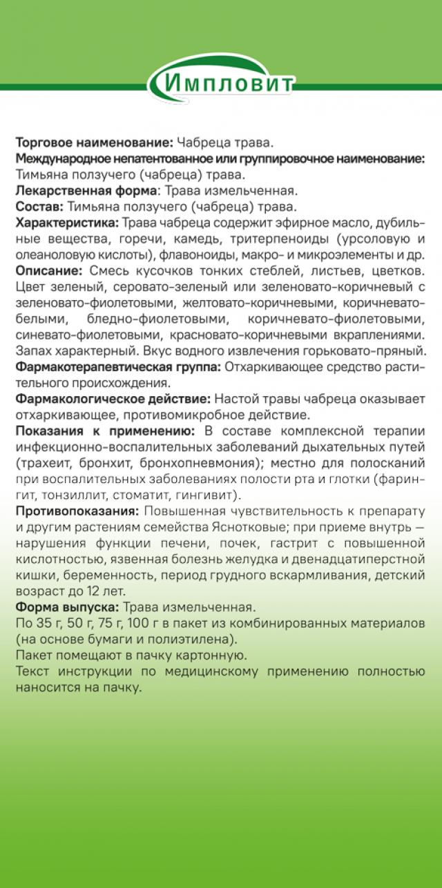 Показания к применению: настой травы чабреца применяют внутрь в качестве отхаркивающего средства при воспалительных заболеваниях дыхательных путей -ларингитах, трахеитах, бронхитах, бронхопневмониях, местно-для полосканий при воспалительных заболеваниях полости рта и глотки.