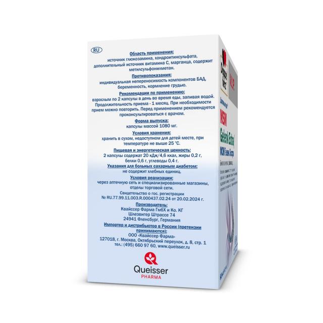 В качестве дополнительного источника глюкозамина, хондроитинсульфата, дополнительный источник витамина С, марганца, содержит метилсульфонилметан.