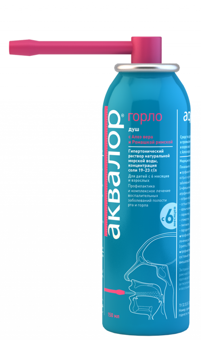 Средство для орошения и промывания горла для детей и взрослых «Аквалор горло мини с Алоэ вера и Ромашкой римской» и «Аквалор горло с Алоэ вера и Ромашкой римской» применяется для профилактики и комплексного лечения острых и хронических воспалительных заболеваний полости рта и горла (инфекционных, аллергических, атрофических), состояний после хирургических вмешательств в полости рта и горла, в период подъема простудных заболеваний. Предназначено для увлажнения горла и удаления патологического содержимого с поверхности слизистой оболочки полости рта и горла. Оказывает благоприятное воздействие на слизистую оболочку полости рта и горла, способствует уменьшению дискомфорта и сухости в полости рта и горла. После промывания полости рта и горла средством для орошения и промывания горла для детей и взрослых «Аквалор горло мини с Алоэ вера и Ромашкой римской» и «Аквалор горло с Алоэ вера и Ромашкой римской» повышается терапевтическая эффективность лекарственных средств наносимых на слизистую оболочку полости рта и горла и сокращается продолжительность респираторных заболеваний. Условия применения: для индивидуального применения и в условиях медицинских учреждений.