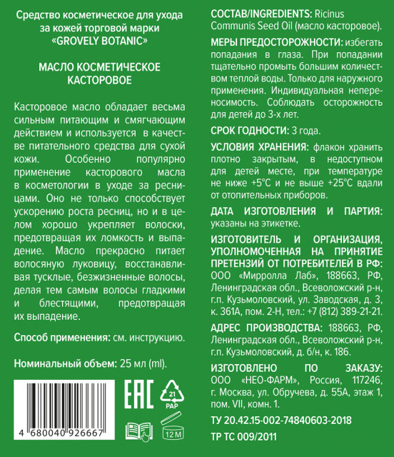 Масло касторовое косметическое 25мл Гровели Ботаник