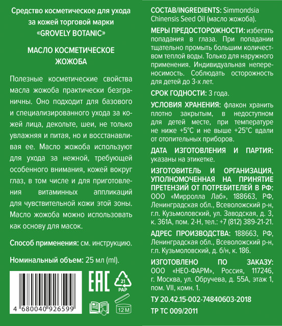 Масло жожоба косметическое 25мл Гровели Ботаник